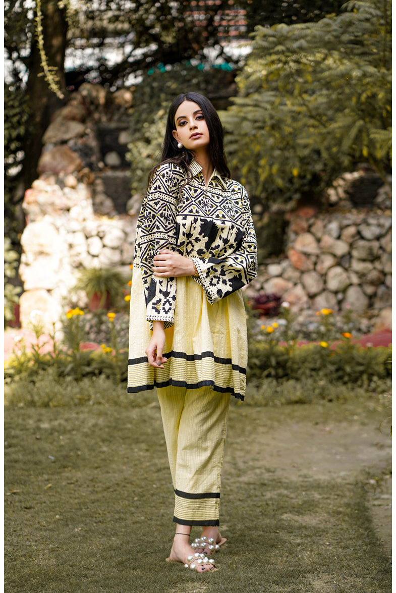 The set includes collar neck kalidar shirt, palazzo. The suit set is block printed and stitched in A-line style. Perfect for summers