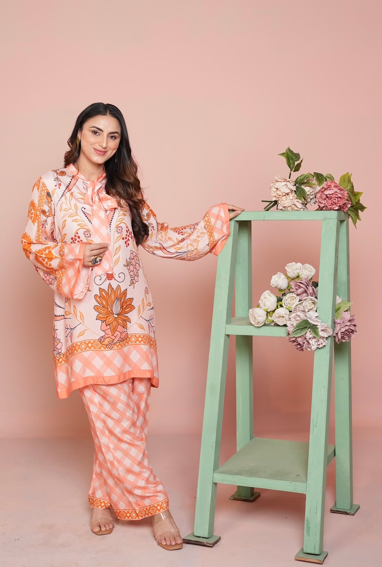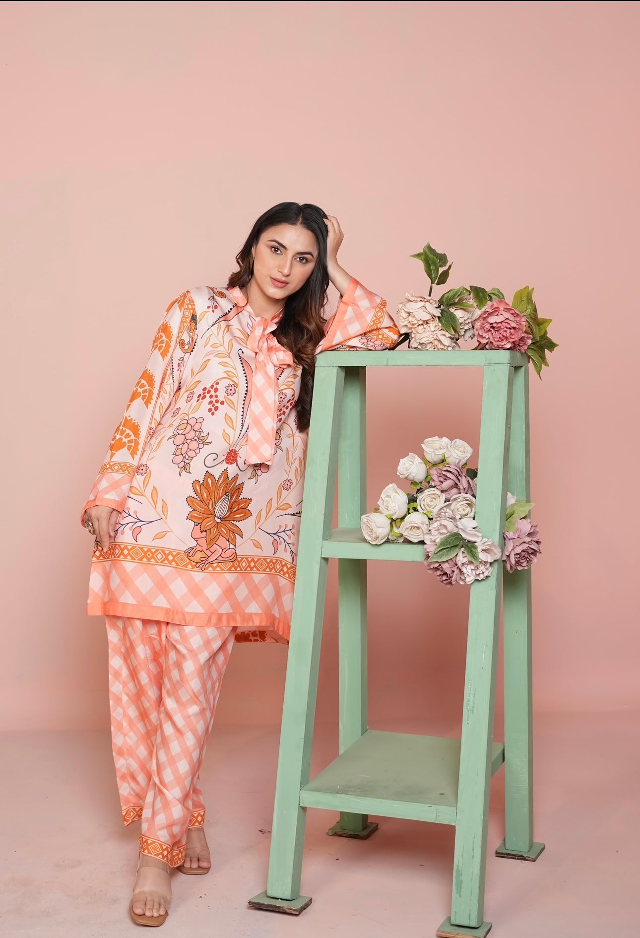 The Peach Gingham Crepe Set Collection features a charming and elegant design characterized by its soft peach color and classic gingham pattern. Made from high-quality crepe fabric, this collection offers a lightweight and breathable feel with a flattering drape. The set includes various pieces such as blouses, skirts, and trousers, each crafted to provide a comfortable yet polished look. Ideal for both casual and semi-formal occasions, the Peach Gingham Crepe Set Collection combines timeless style with modern sophistication.